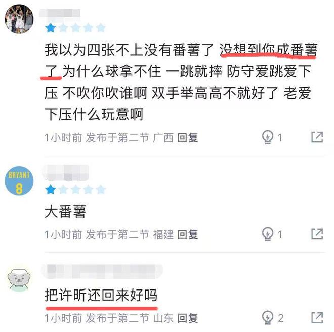 焦泊乔的低迷,也让球迷感慨起来:“我以为四张不上,没有番薯了,没想到你成番薯了”、“把徐昕换回来好吗?”